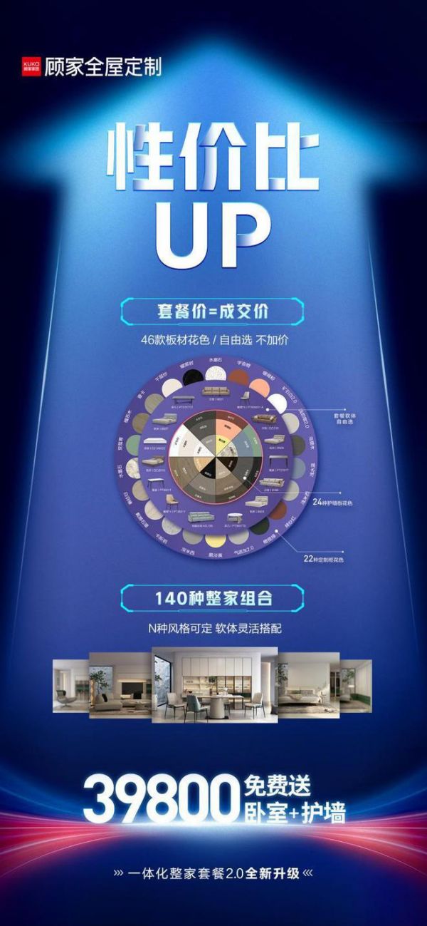 早在今年2月,顾家家居便基于用户生活方式和生活场景的洞察,发布“全自制、不拼凑、零增项、自由选”的39800一体化整家套餐,率先开启一体化整家新时代。9月,依托“六位一体”的企划研发、设计赋能、店态打造、制造品控、供应链服务和成本管理的能力,顾家升级推出39800一体化整家套餐2.0版,从品牌向上、品质向上、服务向上、性价比向上4大层面,锚定用户价值,为消费者量身定制一站式整家解决方案。