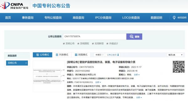 2023年11月17日消息,据国家知识产权局公告,美的集团股份有限公司取得一项名为“壁挂炉温度控制方法、装置、电子设备和存储介质”的专利,公开号CN117073057A,专利申请日期为2023年11月。