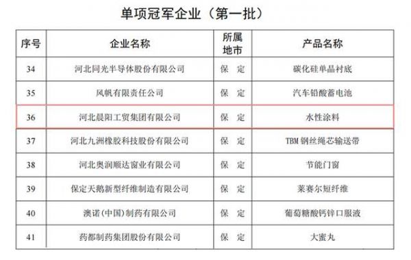 日前,河北省工业和信息化厅公布第五批河北省制造业单项冠军企业及通过复核的第一批、第二批省级制造业单项冠军企业(产品)名单。其中河北晨阳工贸集团有限公司(水性涂料)顺利通过省级制造业单项冠军企业(第一批)复评。此前,河北晨阳工贸集团曾于2019年入选首批122家河北省制造业单项冠军企业名单。