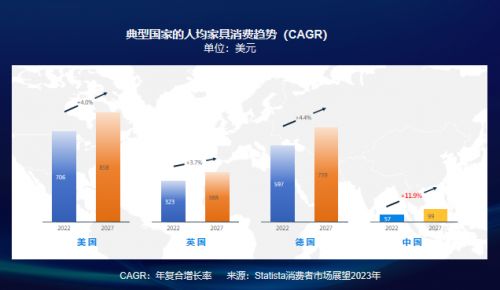 而在众多消费品类中,上升空间最大的,家居类必然算其一。知名研究型数据统计公司Statista报告显示,2022年美国人均家居消费约706美元,中国仅为57美元,不到美国的十二分之一。在中国国力日渐上升、居民生活水平提高的过程中,家居消费的升级潜力将是万亿级的市场。