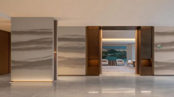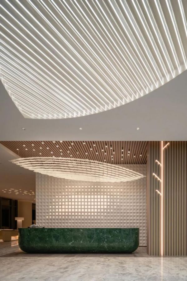在建筑材料方面,三棵树始终秉持环保理念,整体设计中80%以上的产品均来自于三棵树,全系健康产品的应用真正做到了“让凡是空气接触到的地方都有三棵树安心守护”,达到装修后“马上住”的标准。整个大厅立柱全部喷涂外墙涂料天彩石,在还原石材特性的同时降低对石材的开采,高仿真的效果宛若天成胜似自然。大堂墙面则选用突破行业工艺的三棵树小森板替代天然木材,实现一板到顶的设计效果,作为整体空间的点睛之笔,看起来简洁却不失沉闷,细看之下,能够探索到墙面独特的纹理细节。