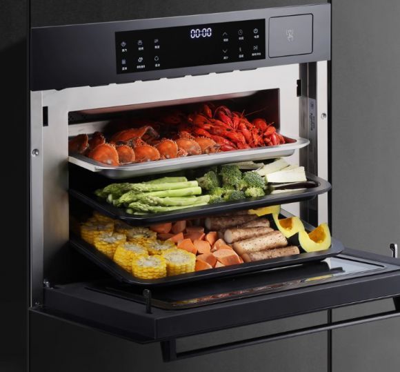 为满足家厨主理人们在家也能更便捷的烹饪品类丰富的菜肴,同时减少厨电产品在厨房的占比,解放家居面积,拓宽欢聚场地,兴邦厨电先后推出了微蒸烤炸4合1一体机和集成烹饪中心-即蒸烤一体集成灶。
