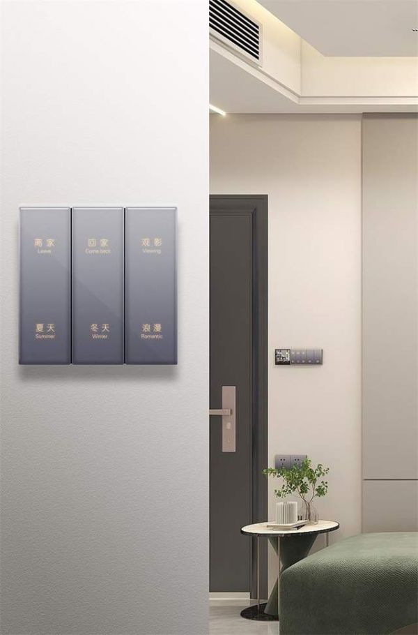 家的智能开关的控制方式有:语音控制、手机APP远程控制、触摸屏控制、物理按键控制。用户可调节光源亮度、色温,体验不同的场景光,比如:回家、离家、观影、会客、夏天、冬天等场景模式。另外,用户可随心选择多规格面板,也可以个性定制刻字。场景可雕刻回家、浪漫等字样,开关可雕刻筒灯、客厅灯等字样。