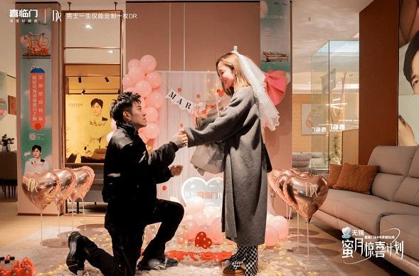 粉色的爱心和蝴蝶结,遍地多巴胺颜色的气球,温馨的LOVE灯光,氛围感十足的花瓣,在这浪漫的背景下,一对甜蜜恋人正在演绎爱的告白,手捧鲜花的男士单膝跪地,掏出一枚定制的钻戒为爱人戴上,戒指未来的主人笑意盈盈,满是浓浓的幸福。这场充满仪式感的求婚,让甜蜜浪漫持续升温。这有爱又让人感动的一幕发生在喜临门年度最大IP--“蜜月喜临门第九季”活动现场,充满着罗曼蒂克的色彩,让现场的人欢呼声不断,更让这对新人留下了美好的回忆。