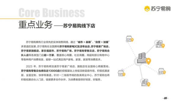 苏宁易购集团股份有限公司成立于1990年是中国领先的零售服务商,目前在全国经营超1万家门店,并形成线下实体店、线上苏宁易购主站等相结合的线上线下融合的零售渠道。苏宁易购多次蝉联《中国 500最具价值品牌》零售行业第一, 并在2022年发布的《中国连锁百强企业排行榜》中,以领先行业的连锁经营能力蝉联榜首。