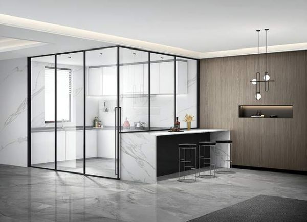 例如客厅隔断,一般是采用四移门,厨房隔断则多采用L形对碰联动门,卫生间隔断则多用单移门或平开门,可根据空间格局和自身的需求进行选择。