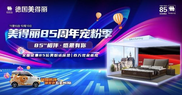 美得丽85周年宠粉季,是一场品牌与粉丝用户之间的深度互动,以产品附带的情绪价值,让用户感受到美得丽独特的宠爱和关怀,借助85周年庆活动,美得丽全方位释放“宠粉、感恩”信号,本次活动合计六大钜惠福利,转发享豪礼、征集美粉送床垫、护脊首选之礼、双卧省心购、百万现金返现、抽五菱神车MINI,用户不仅能享受到活动优惠,更能体验社交互动的乐趣。通过惊喜内容和超级福利,美得丽实力为用户带去好价、好礼、好产品的温情回馈,最大化满足用户需求,让消费者感受到美得丽淋漓尽致的宠粉计划,共同携手将活动进行到底。
