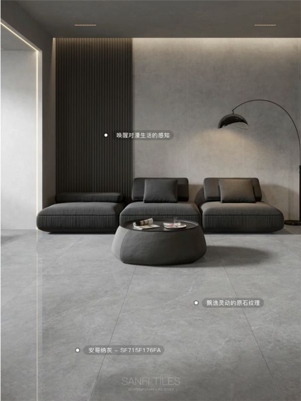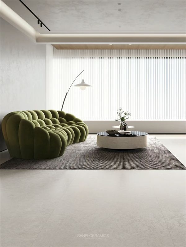 灰色沙发搭配圆形灰色小桌子,让整体色调更为协调,百叶窗让室内自然光线更充足,为客厅打造开阔视野。地面采用兴辉瓷砖原石·安哥纳灰铺贴,纹理的细腻为空间增添不一样的细节质感,沉稳而有格调。