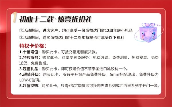 2、活动期间,购买尚益达门窗十二周年特权卡可享受以下福利: