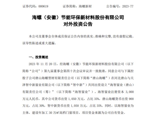 2023年11月20日,海螺新材(000619.SZ)公告称,公司第九届董事会第四十次会议审议并一致批准,同意公司与下属控股子公司唐山海螺型材有限责任公司(以下简称“唐山海螺”)在河北唐山与天津智中新窗业有限公司(以下简称“智中新”)共同出资设立“海智窗业(唐山)有限责任公司(筹)”(以下简称“海智窗业”)。
