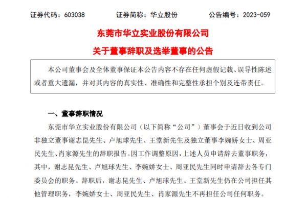 华立股份(603038.SH)近日公告称,公司董事会近日收到非独立董事谢志昆先生、卢旭球先生、王堂新先生及独立董事李婉娇女士、周亚民先生、肖家源先生的辞职报告。