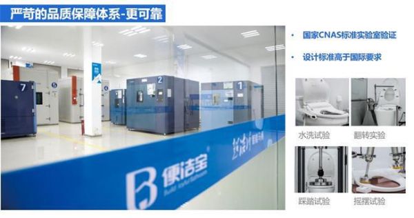便洁宝十分重视产品质量,按照国家CNAS标准筹建了智能马桶专业实验室,模拟中国南北环境差异、卫生间各种使用环境,模拟各种恶劣的环境和严苛的条件,对产品各项性能进行一系列模拟测试。