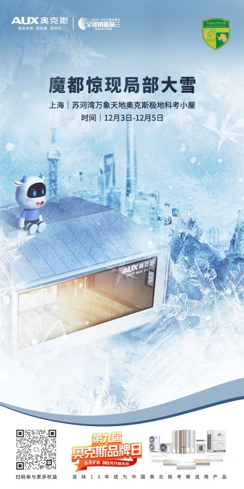 12月3日-5日消费者可抵达上海徐河湾万象天地,参与奥克斯空调POP-UP快闪活动,即可获取极地“护照”,体验“极地环游”的乐趣。在展区内打卡点收集勋章,更可换取伴手礼和抽奖机会。除此之外,消费者还可通过奥克斯空调极地科考小屋,感受奥克斯语音空调奥知音Ⅱ的智慧便捷,观赏冰雕装置,了解品牌365天只换不修的政策。现场还有微缩版“雪龙”号模型展出,为活动增色。同时,鹅毛大雪落下,满足大家在南方看雪的期待!