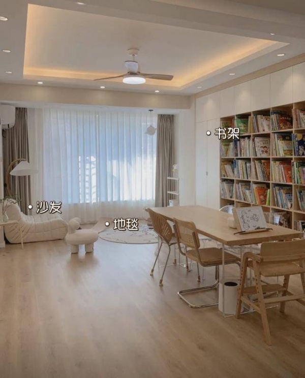 如果空间不够,可以选择不要电视背景墙和沙发,组成满墙书柜,这样可以最大化利用空间,同时也能为家庭成员提供一个良好的阅读环境。在设计中,可以考虑将一面设计为白色,一面设计为木色,增加整个空间的层次感和视觉效果。