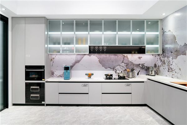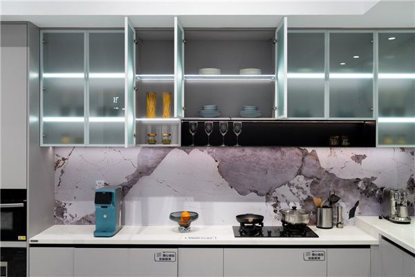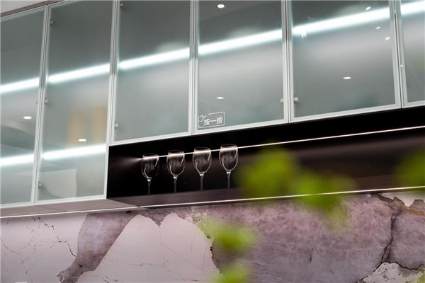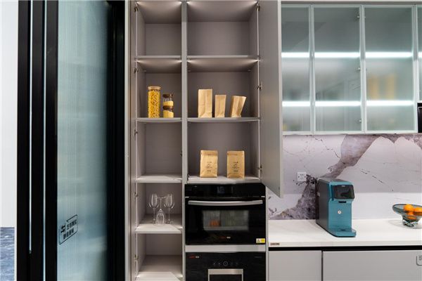 部分柜门采用玻璃材质,拥有更多变幻的色彩和精致的琉璃感,同时提升空间通透性,有更好的透光效果,使得整个厨房精致通透。
