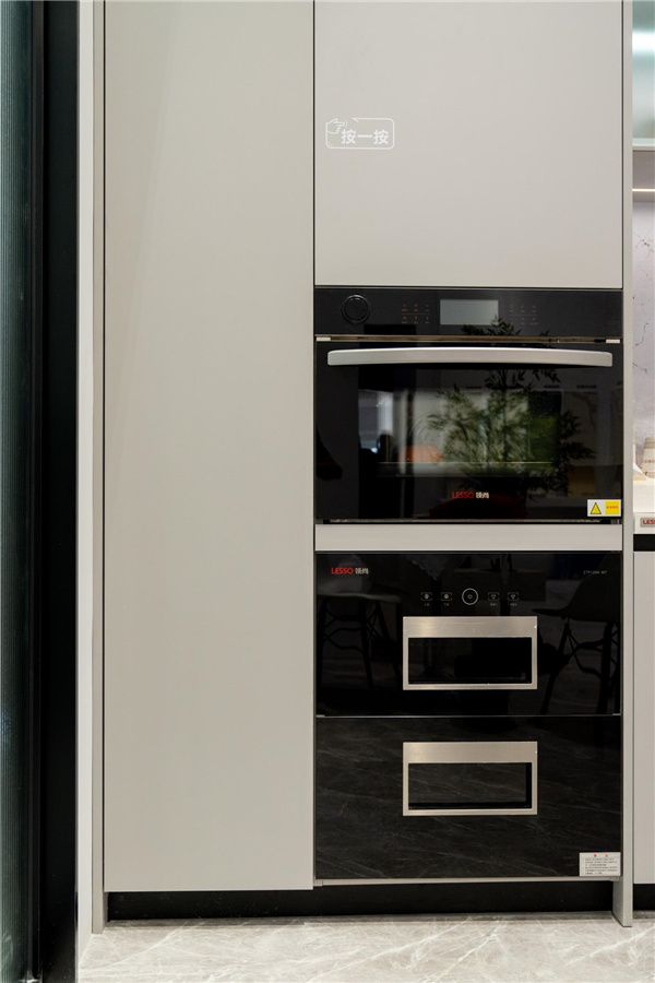 内嵌灶具与烤箱、消毒柜,不仅起到了节省空间的作用,还让整体更加清爽美观,极大程度提升了空间的可利用率,减少空间的浪费。