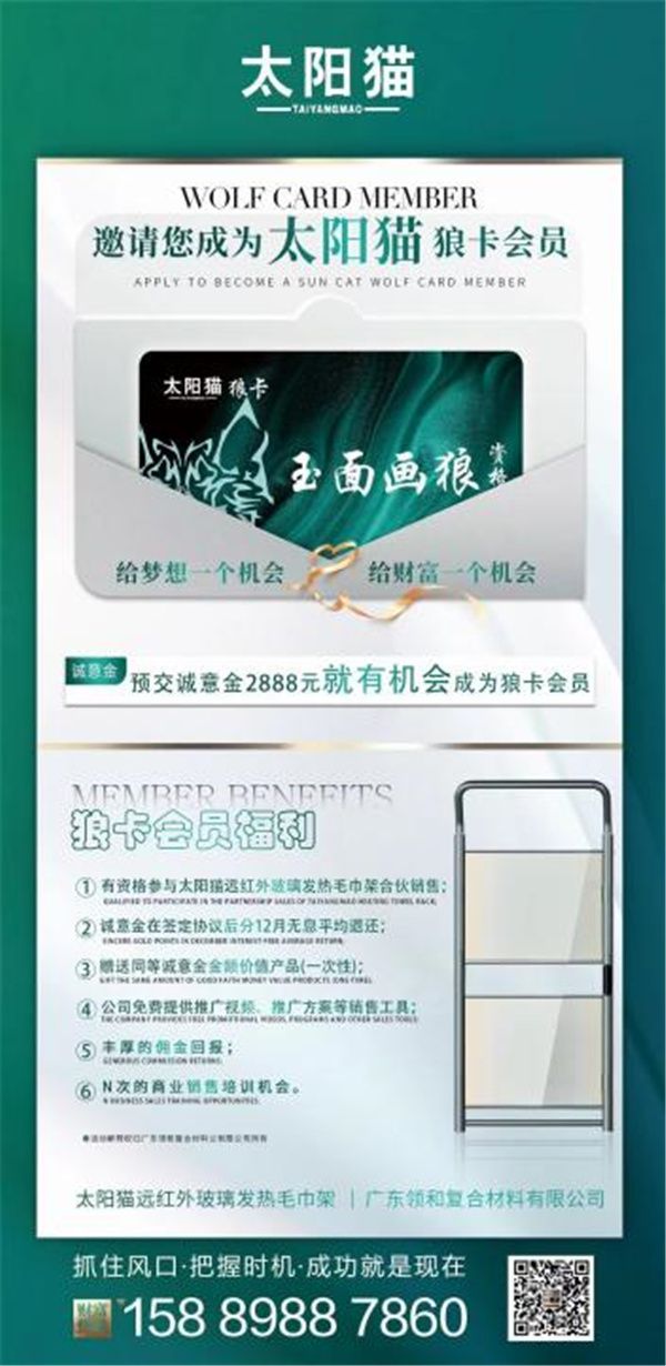 为了更好的服务会员,太阳猫在创立之初就确定了第一批核心狼卡会员VIP福利,旨在为太阳猫的核心会员打造专属定制化且具有太阳猫品牌特色的会员仪式感。为核心会员提供太阳猫授权书、交付仪式、同等诚意金金额价值产品、货源保障、资源性产品优先购买、推广视频、推广方案、多次商业销售培训机会等一系列增值服务项目,综合提升狼卡会员体验感。