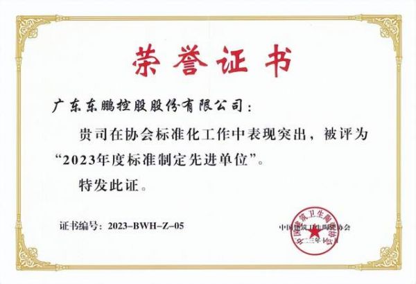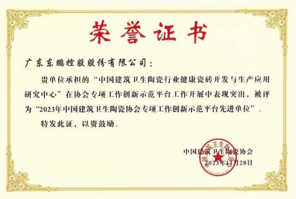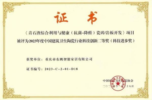 会上还对建筑卫浴行业领域的卓越企业及平台进行表彰,东鹏控股被授予“企业信用评价AAA级信用企业”“2023年度中国建筑卫生陶瓷协会专项工作创新示范平台先进单位”“2023年度标准制定先进单位”,东鹏重庆基地《青石渣综合利用与健康(抗菌-降醛)瓷砖/岩板开发》项目荣获2023年度中国建筑卫生陶瓷行业科技创新二等奖(科技进步奖)。