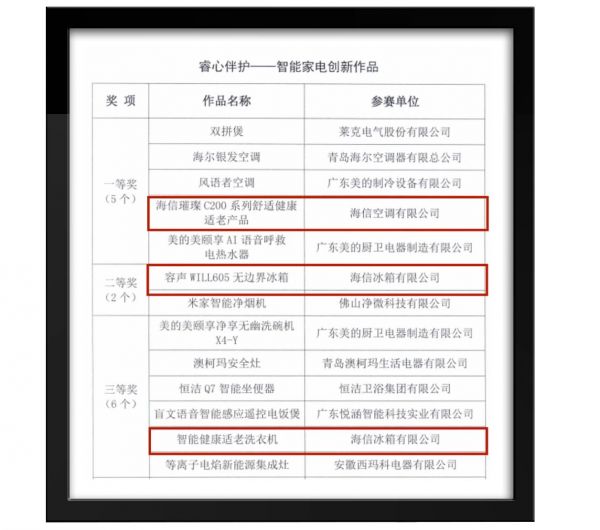 近日,由中国轻工业信息中心、中国轻工业发展研究中心和中国家用电器研究院联合主办的“第二届轻工适老创新产品及智能健康解决方案大赛”正式公布获奖名单。凭借对“银发群体”的用户洞察及行业领先的产品创新实力,海信家电(SZ 000921,HK 00921)旗下海信璀璨空调C200系列舒适健康适老产品、容声WILL605 无边界冰箱、智能健康适老洗衣机等3个产品获得“睿心伴护——智能家电创新作品”大奖,并分别荣获银发臻品奖、关爱智芯奖、健康呵护奖等3个单项奖。同时,海信智慧型健康舒适环境控制系统荣获“慧心智护——创新解决方案作品”一等奖。