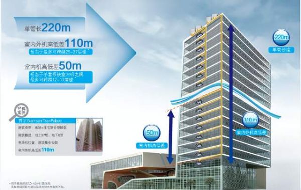 另外,超长配管技术,总管长可达1000m,单管长可达220m,室外机高低差为110m,灵活应对多种形式、规模建筑设计与摆放需求。