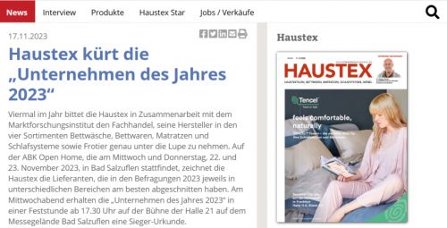 作为欧洲领先的行业杂志,《Haustex》在市场上已有60多年的历史,也是德国唯一一本针对床、床上用品、被套、床垫/睡眠系统的专业杂志。其凭借数据调研和报告的权威性,成为了德国床垫工业协会(Fachverband der Matratzenindustrie)和德国羽绒和羽毛工业协会(Verband der Daunen- und Federnindustrie)的官方合作研究机构。