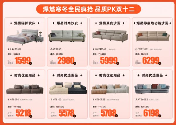 年末,太子家居双12拿出当家爆品做福利,总部直接补贴,消费者尽享工厂价,优惠力度大。如太子家居爆款时尚沙发,原价6032元,双12工厂补贴价仅2980元,以低于5折的价格,将时尚沙发带回家!还有真皮沙发、时尚沙发、靠墙功能沙发、猫爪软床......限时限量优惠,喜欢赶快入手吧。