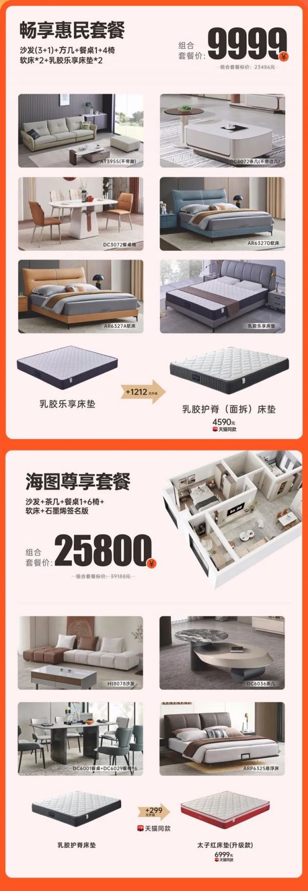 双十二活动,太子家居推出整家家具惠民套餐,兼具颜值与品质的两室两厅11件套,仅需9999元即可到手,也有不同套餐供消费者选择。海图尊享套餐价25800元,海图风格家具无论材质的运用还是造型设计上,都呈现出一种高级感;季唯尊享套餐价43800元,季唯风格家具从品质控制、舒适设计、外观美学上诠释出现代轻奢美学。客餐卧家具套餐,一站式配齐省心更省钱。