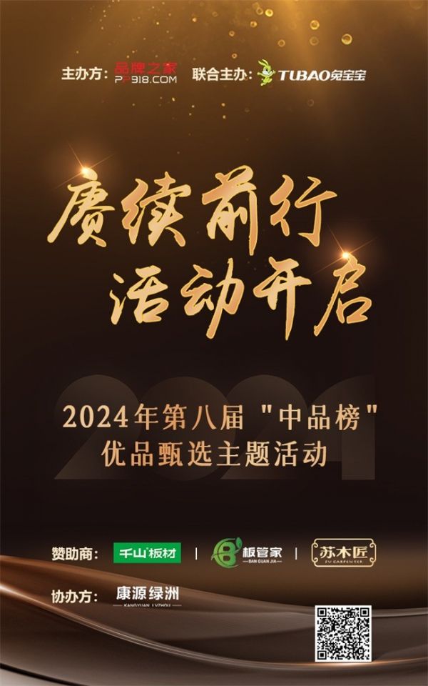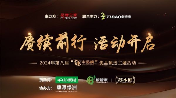 在过去的七届活动中,中品榜以其严格的评选机制和广泛的影响力,成功地塑造了家居建材行业内的标杆形象,为企业提供了展示自身实力、扩大品牌影响力的舞台。12月12日,赓续前行|第八届“中品榜”优品甄选活动自此启动。本届活动由品牌之家与兔宝宝联合主办,千山板材、板管家板材、苏木匠倾情赞助,康源绿洲板材协办,现诚邀业内各大品牌企业踊跃报名参选!