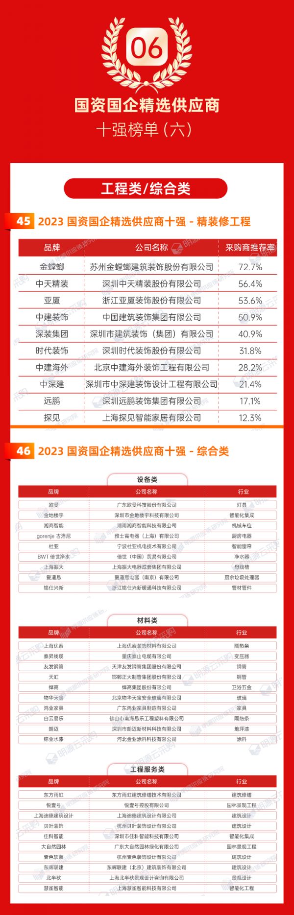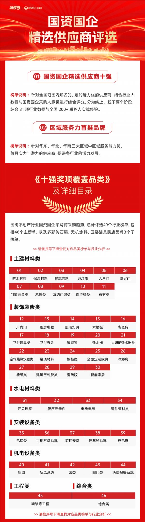 在供应商端:结合行业大数据与过去一年国资国企采购商真实履约情况,为行业评选出“国资国企精选供应商十强”“区域服务力首推品牌”。高效赋能不动产供应链,助推行业良性发展。