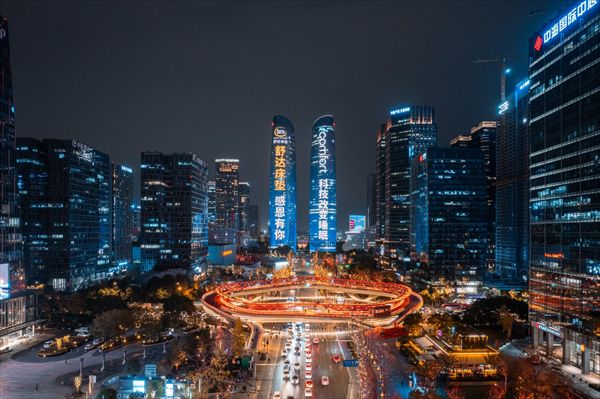 当是时,夜幕降临,华灯初上,站在“交子之环”的天桥上,驻足眺望耸立在城市夜空之中的双子塔,被灯光装点得如同两座晶莹剔透的水晶宫殿。各种颜色的灯光在塔身上流转,不断变化着色彩和图案,周围的大厦都被五彩斑斓的灯光装点得如梦如幻,塔尖上的激光射线直冲云霄,与星空交相辉映。