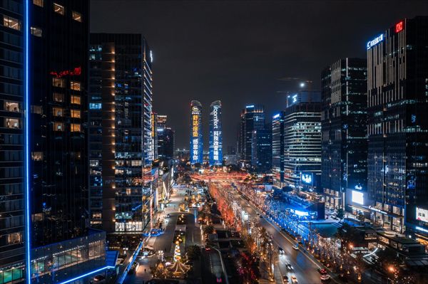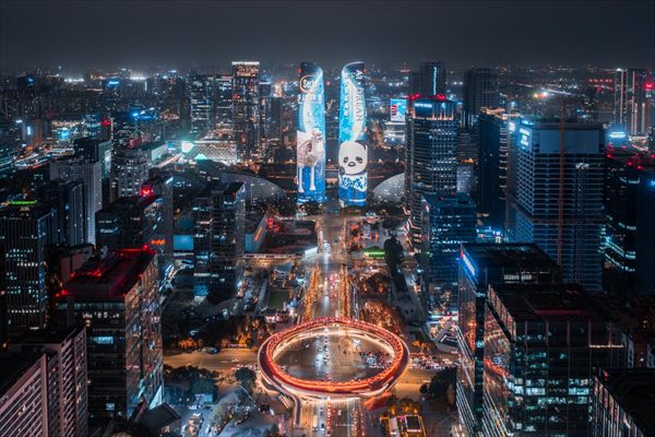 在世界上最长的城市中轴线——天府大道最北端西侧,伫立着两座高耸入云的大厦——金融双子塔。白天它是平平无奇的大厦,夜晚穿上绚丽闪耀的彩衣,摇身一变成为成都夜晚瑰丽的一道风景线。