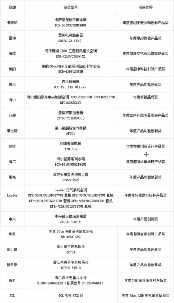 本次荣获“金选奖”的品牌主要有海尔、中兴、美的、海信、卡萨帝、东芝、雷神、亚都、吉米、莱小厨、莱克、创维、Leader、华凌、TCL、碧云泉等,产品涵盖冰箱、电视、路由器、空调、中央空调、净水机、洗碗机、洗地机、除螨仪、电饭煲、加湿器等品类。(具体产品型号见文末附表)。