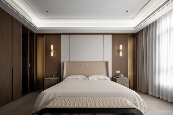 色彩比较沉稳、低调,多使用或深或浅的木质元素,来创造安静柔和的氛围。而床品、窗帘、床头背景墙等其他装饰细节,也在用色上偏向舒缓、雅致,与整体气质和谐统一,巧妙地传达着家居主人的审美品味。