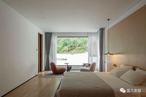 直接面对窗户,最大的好处就是视野广阔,获得足够的光照;窗外赏心悦目的景色,休息时抬头远望,入目美好。其半开放式的卧室布局打破常规设计的惯性思维,集休息、收纳、展示、置物、梳妆为一体,探寻空间里的“尺度感”,寻求更多新意。