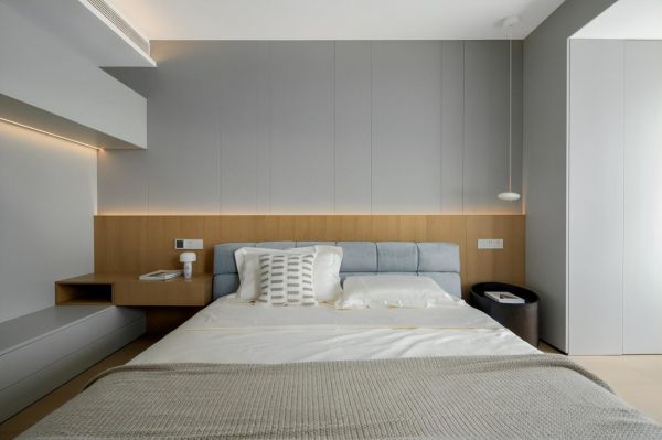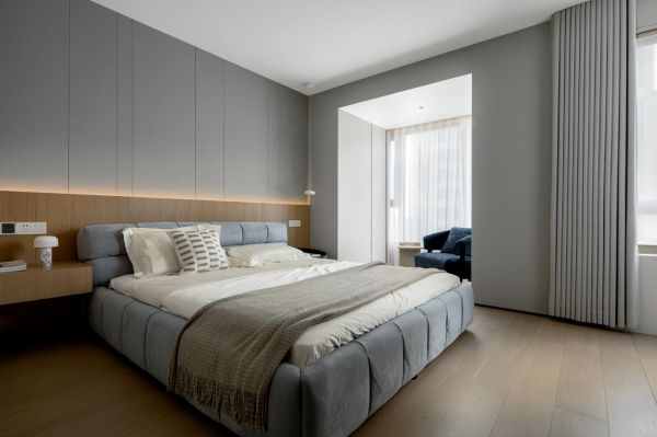 清新的色调,搭配自然材质与原木纹理,营造舒适放松的空间,将个性偏好融入现代北欧,让在家的每一刻都置身于浓浓的自然、简约的北欧风情。其床头背景采用实门柜和挡板装饰盒组合,灵活收纳,使空间兼具设计感与实用性。