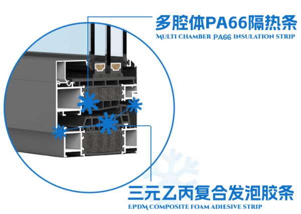 素派门窗采用优质原生铝材,搭配多腔体PA66隔热条,形成多腔体断桥铝型材,大幅降低门窗型材整体传热系数,形成冷热断桥屏障,以阻挡室内外的热量传递,层层递减热量损耗,达到室内防寒保温目的。