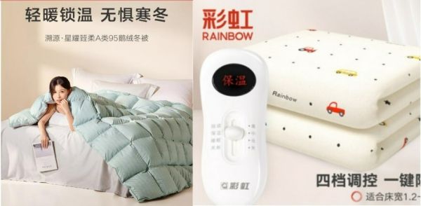 随着全国气温的断崖式下跌,保暖床品成为焕新家的首选,水星、富安娜、罗莱、亚朵星球等大牌位列销量TOP榜前列。保暖床品中,羽绒被成交额同比增长超108%,绒子含量高达95%、洁净度高达1000的罗莱星耀溯源鹅绒被以及水星白绒吹雪鹅绒被成为热销款。此外,保暖防护产品成交额同比增长超150%,让被窝快速升温的电热毯受到追捧,不足百元的彩虹双人电热毯销量暴涨,成交额同比增长超5倍。