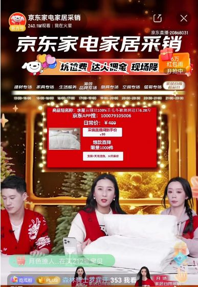 值得关注的是,当天晚上,京东家电家居采销直播间还开启家居日用超级品类日专场,在真5折、抽免单、低至9.9元直播专享价等多重优惠刺激下,吸引了近300万网友的观看,到手价99元的怡黛60支长绒棉四件套、水星百丽丝澳洲羊毛被等低价不低质好物,受到消费者的强烈追捧。