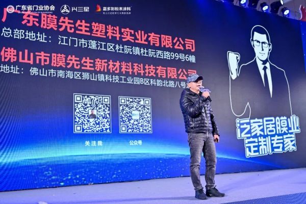 会上,作为泛家居膜业定制专家,膜先生王浩杰董事长发表了主题演讲,从安全防坠、节能环保、提质增效等多方面探讨了贴膜的重要性,并提出"泛家居膜业定制服务闭环"的解决方案,提供定制智能贴膜流水线,赋能企业降本增效,提升产品竞争力。