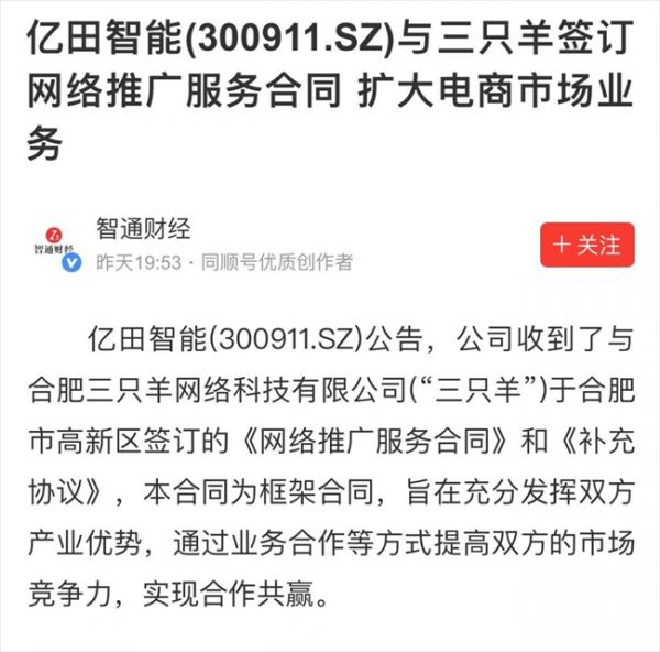 亿田公告称,公司已与国内头部电商企业「合肥三只羊网络科技有限公司」签订《网络推广服务合同》,旨在充分发挥双方产业优势,通过业务合作等方式提高双方的市场竞争力,实现合作共赢。