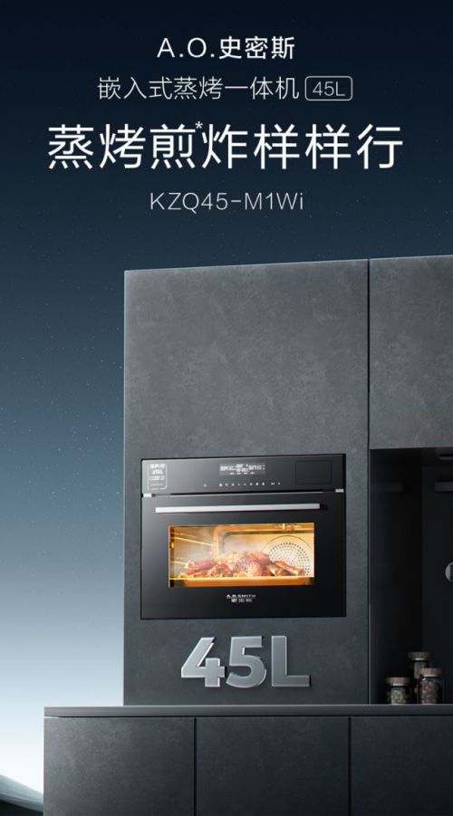中式厨房空间有限,但随着居民生活水平提高,饮食却越来越丰富。这种情况下,集成功能的厨电产品就非常有必要。A.O.史密斯蒸烤一体机KZQ45-M1Wi因此应需而生——一台机器,同时满足“蒸烤煎炸”。它创新采用双蒸汽加热系统,可以让全腔快速充盈澎湃蒸汽,上下蒸汽同步蒸得透,即使大块肉类也不用担心夹生。35℃~100℃每一度精准控温,让不同食材都能锁住鲜美,保留原汁原味;“风焙烤、热风烤、烧烤”等多种模式,多维立体烘烤,均温烤制,加上蒸汽加持,让食材肉嫩皮脆、鲜嫩多汁,而且,高温热风循环会逼出食材自身油脂,无需额外放油,加热管烘烤食材,表皮金黄酥脆,好吃不腻。为了让厨房小白也能轻松烹饪。
