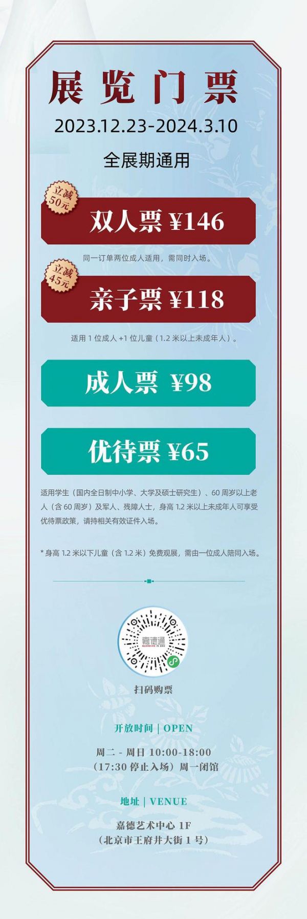 *嘉德艺术中心保留检查享受优待票或免票人群身份的权利。