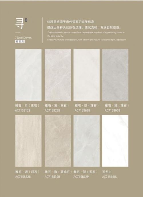 因为大自然的鬼斧神工,创造出风格迥异、无与伦比的原石石纹,让箭牌瓷砖能从中得到新品创新灵感,为创造出质感质朴和谐的原石石材纹理瓷砖产品,箭牌瓷砖择取玉石、大理石、洞石、莱姆石4款在国外大热的天然纹理石材,1:1复刻石材美感,并以宋代文人独特的赏石审美标准为灵感,进行独立创新研发,并在2023年冬季推出全新超品「寻」系列雅石集,将赏石的自然意趣融入砖面之中。