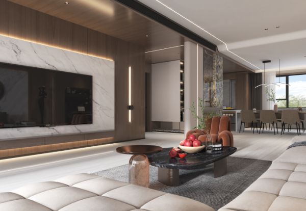 低调内敛且富有品味的精神内核,是很多中产者寻找的生活方式。本案例利用软装和材质营造“老钱风”,在具备艺术性和贵气的同时,兼顾舒适度。老钱风的精髓在于不以高调贵气来吸引目光,而是主张崇尚品质、追求经典的时尚哲学,通过精致的材质质感比如奢石,协调的软装搭配和舒适细节设计来展露品位与底蕴。