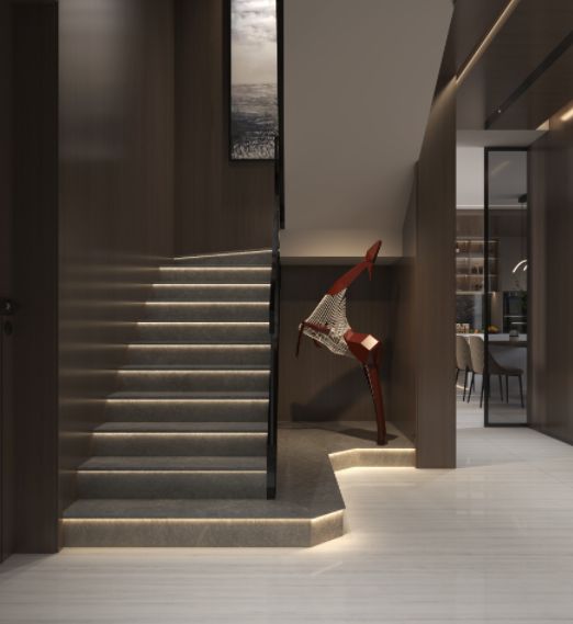 餐厅以奢石圆桌和皮质餐椅为主,用深色调打造复古知性的氛围,开放式厨房将光线引入,摆脱了原厨房的封闭感,尤其地面奢石的运用,会给人岁月的沉淀感。楼梯不仅能承担着中转的作用,奢石阶梯也饱含着艺术的隽永,延续着素雅的配色,奢石纹理自带高级贵气的场域。