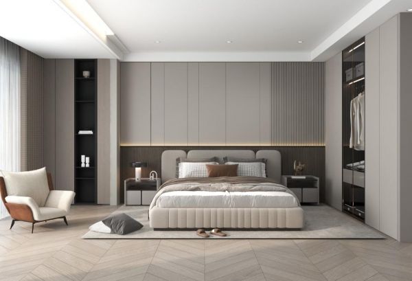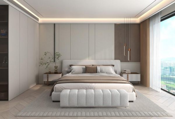 简约不代表着毫无设计,这种精致的简约在线条之间蕴藏着许多巧思,低调却不同凡响。纯净的墙布色彩和线条设计,围合出纯净且优雅的空间氛围,让生活空间的视觉语言在曲直之间得到有序的统一。