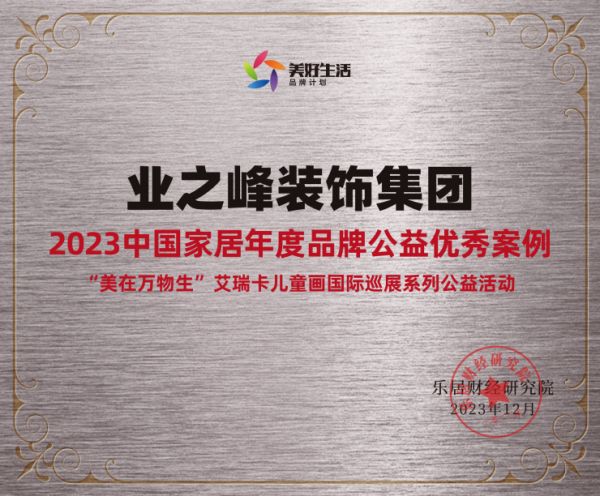 12月12日,2023(第七届)中国地产经理人评选荣誉发布会举行,业之峰的“‘美在万物生’艾瑞卡儿童画国际巡展系列公益活动”荣获“2023中国家居年度品牌公益优秀案例”