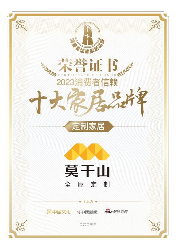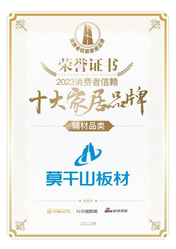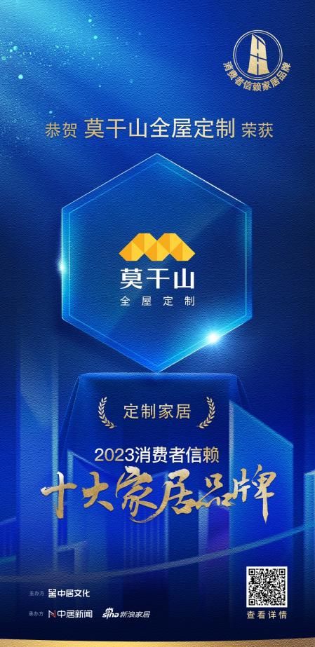 近日,由中居文化主办,中居新闻、新浪家居承办的“2023消费者信赖十大家居品牌”榜单隆重揭晓,历经网络票选、专业评审,莫干山板材、全屋定制凭借卓越的品质和优秀的口碑,双双荣登“2023消费者信赖十大家居品牌”榜单。