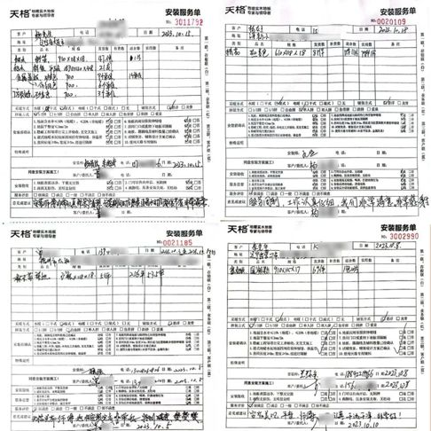 (图:安装服务单”上写满了用户对天格服务的好评)