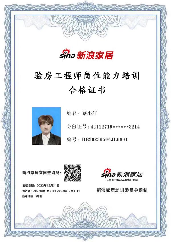 新浪家居验房工程师岗位能力培训合格(湖北地区)——蔡小江